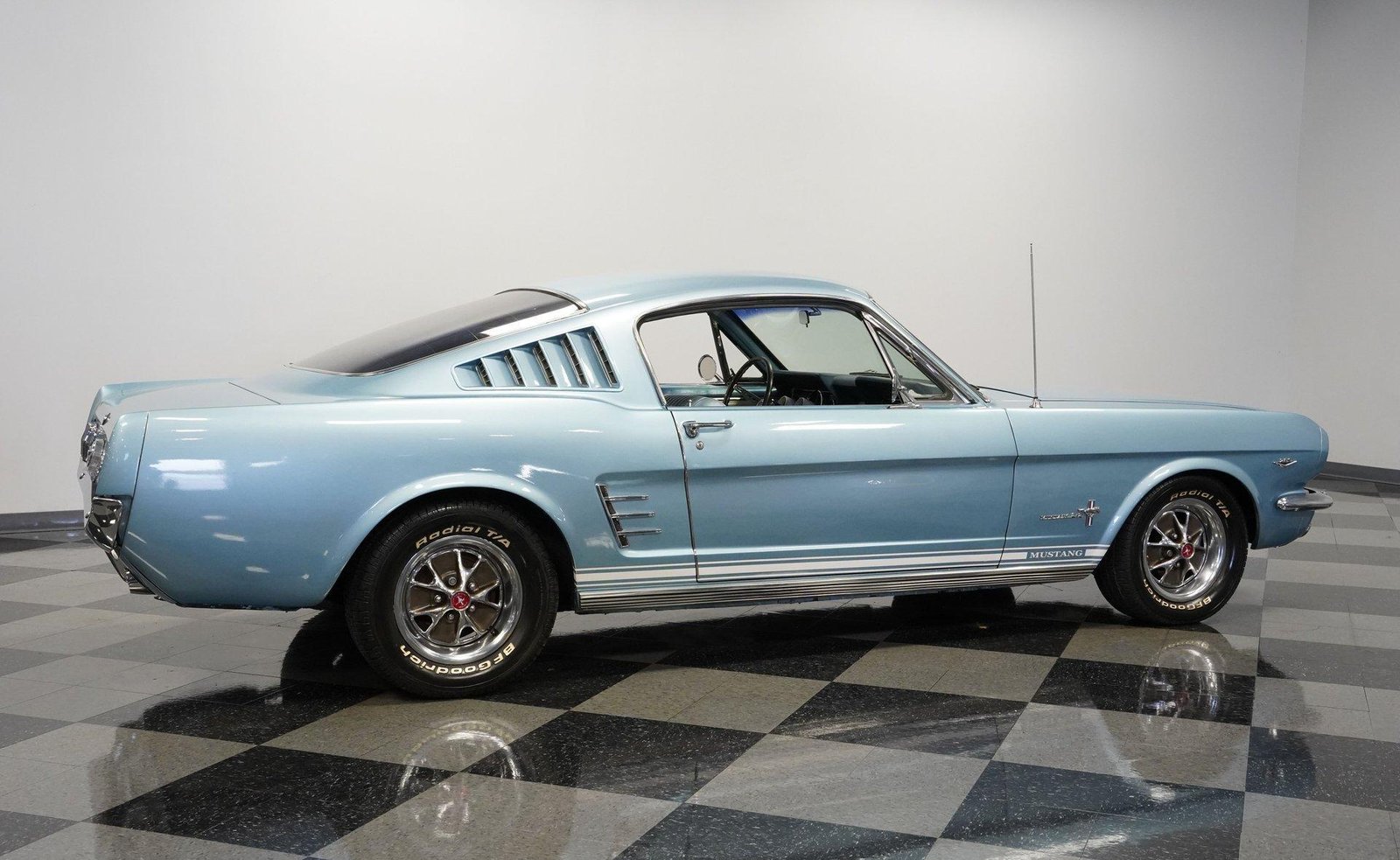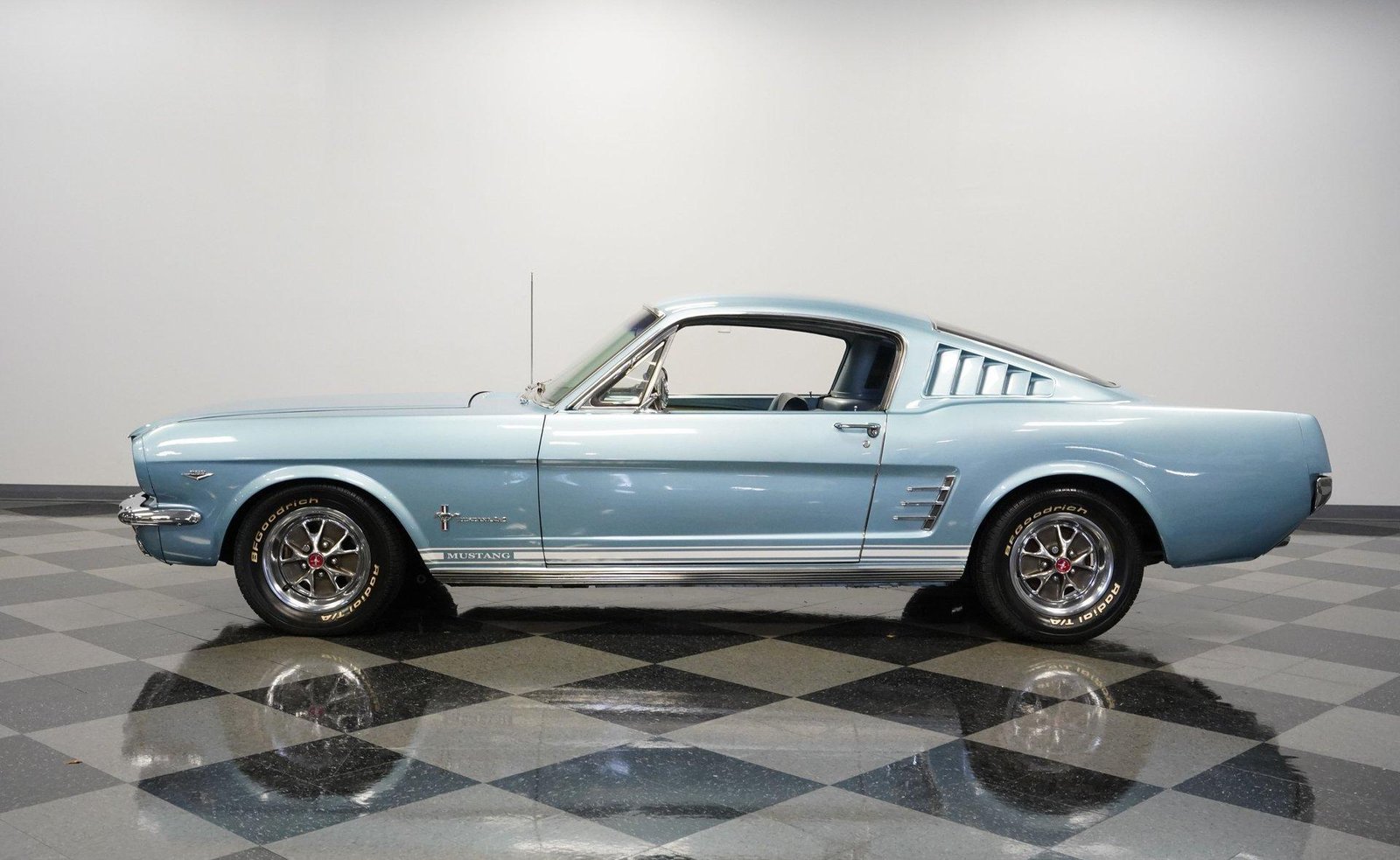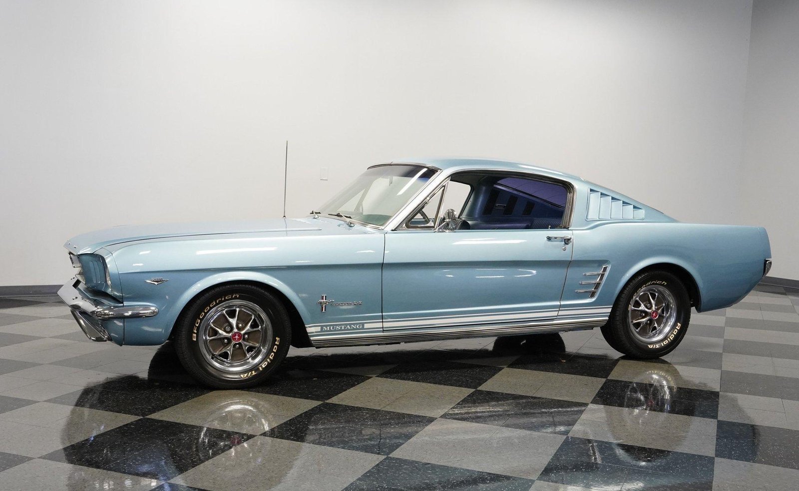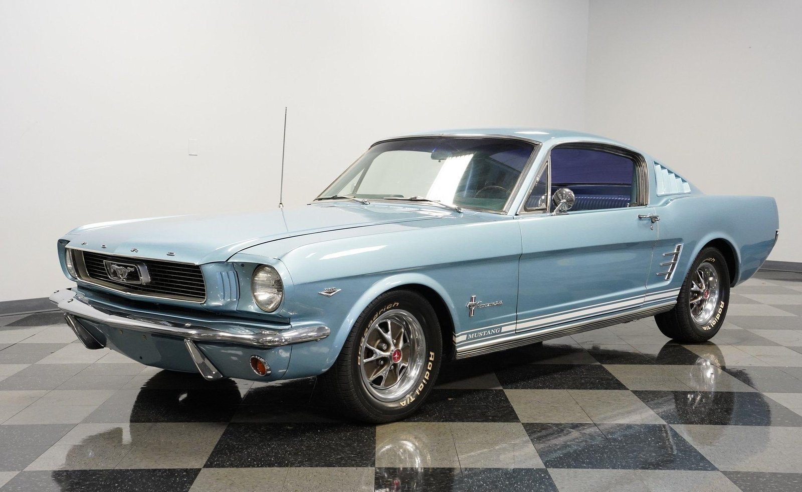 A beautifully finished 1966 Ford Mustang 2+2 Fastback in factory Q7 Brittany Blue — powered by a smooth 289 V8 with C4 automatic, power steering, power brakes, and cold factory-style air conditioning.