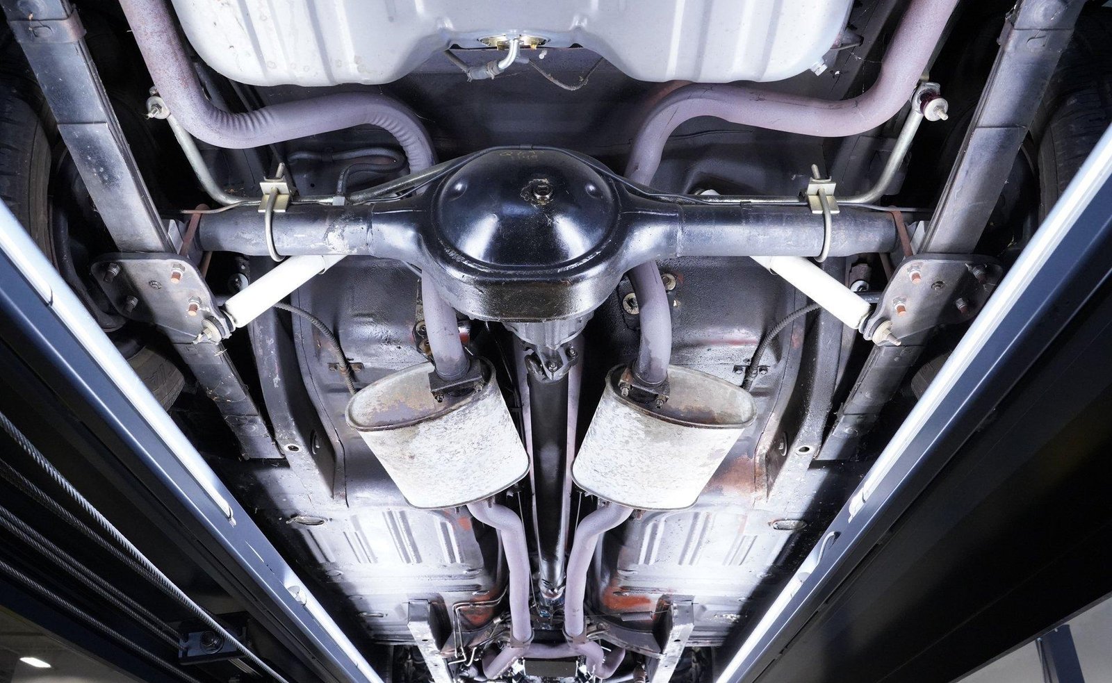 Exterior: Brittany Blue paint accented by chrome bumpers and trim, 14″ wheels wrapped in P215/60R14 front and P235/60R14 rear tires, tinted glass, rocker moldings, and dual exhaust under the rear valance.
