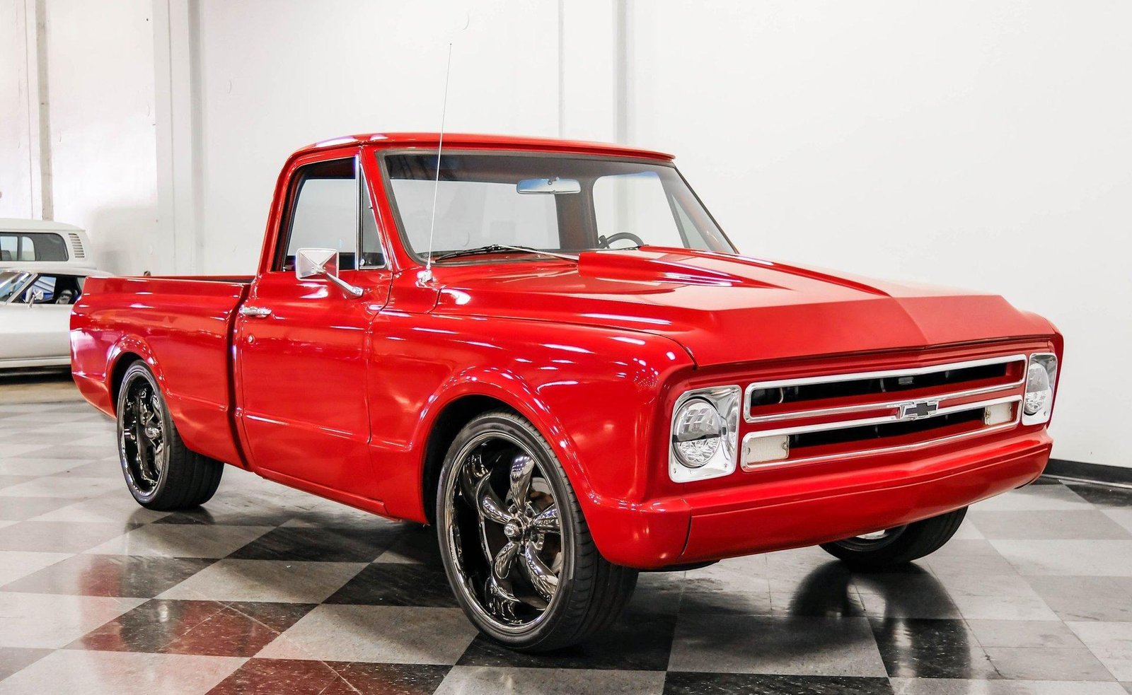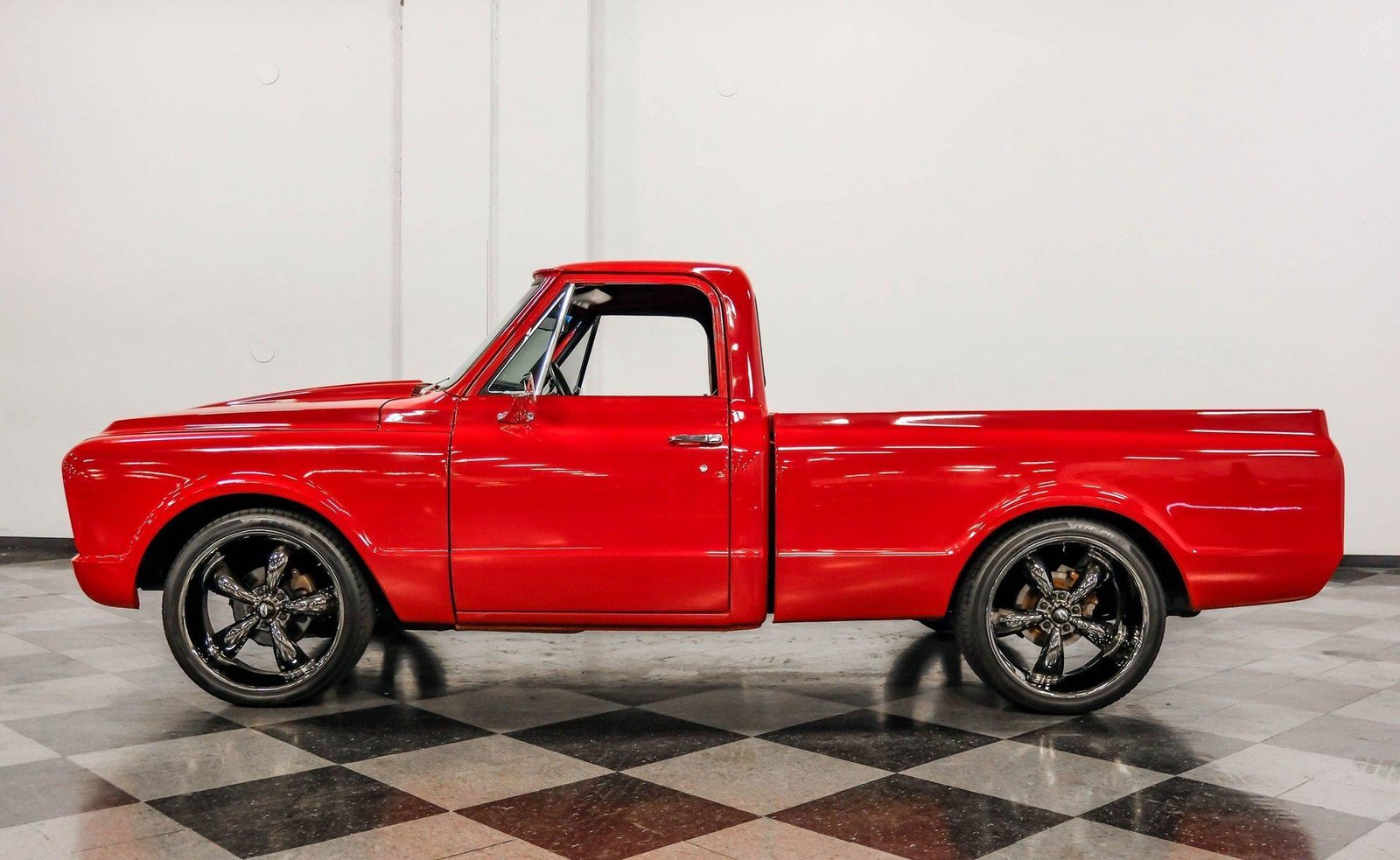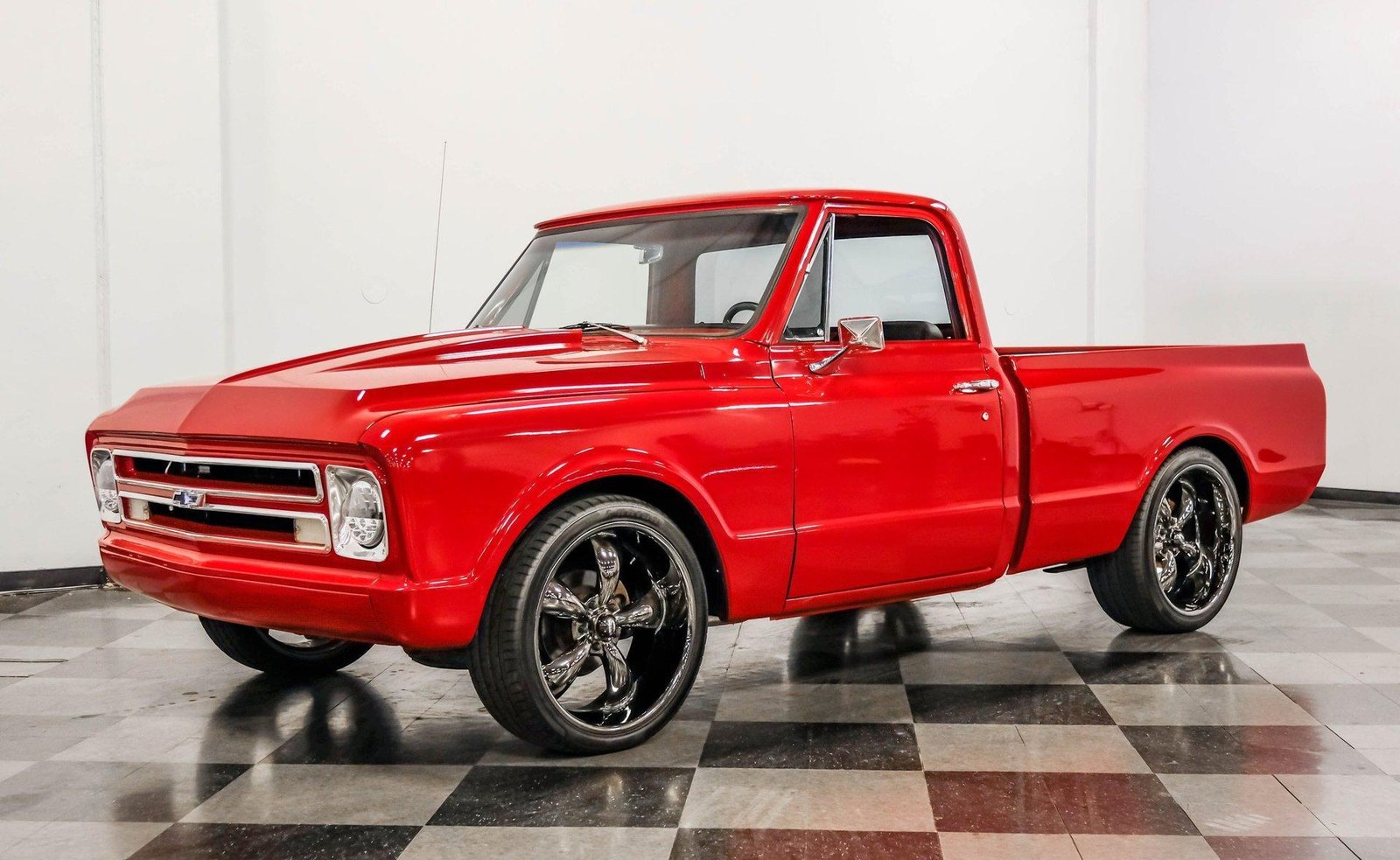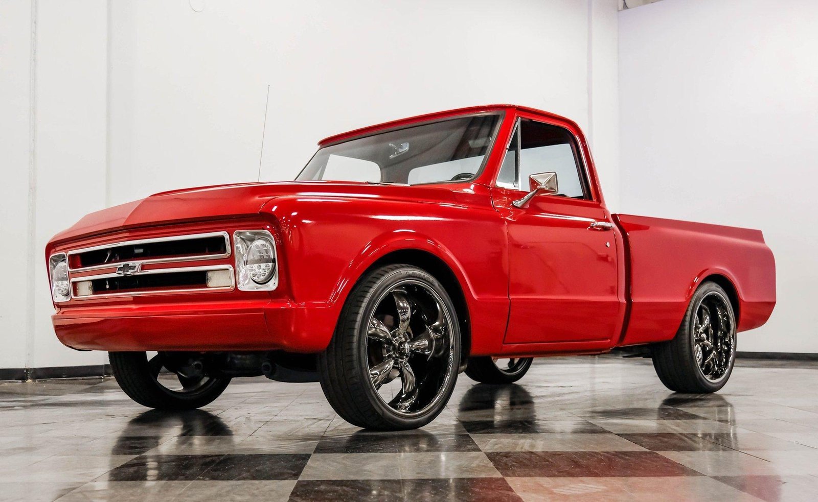 A sleek and lowered 1968 Chevrolet C10 Short Bed, finished in vibrant red with a cowl induction hood, Rhino-lined bed, and massive 22-inch Coys wheels — a modernized classic with serious street presence.