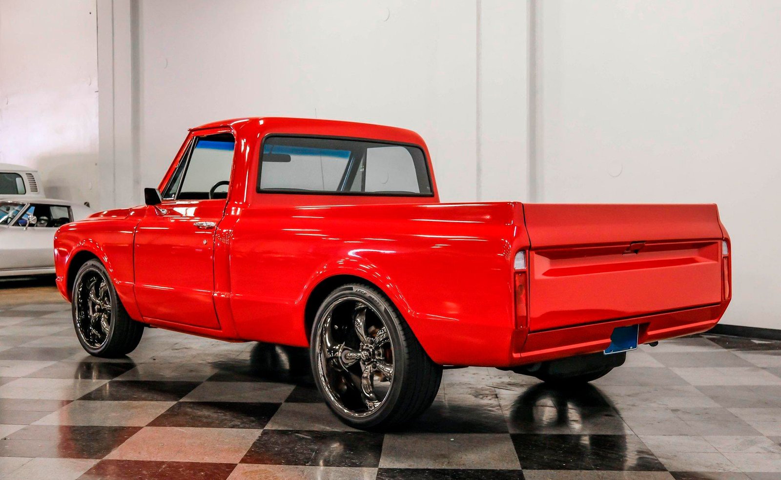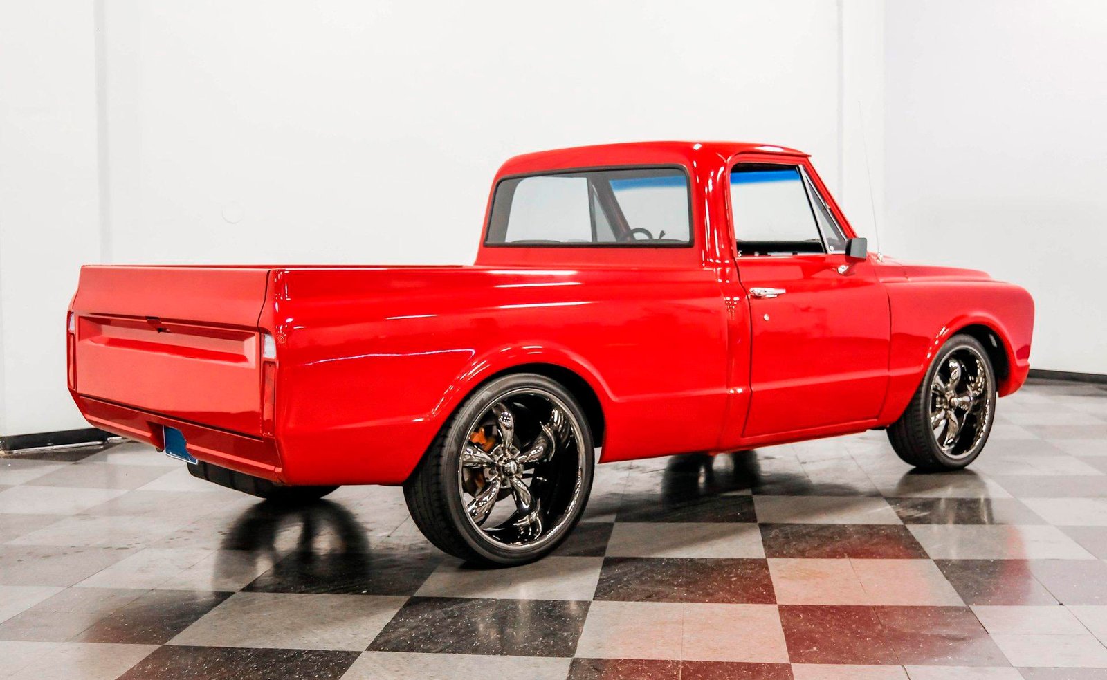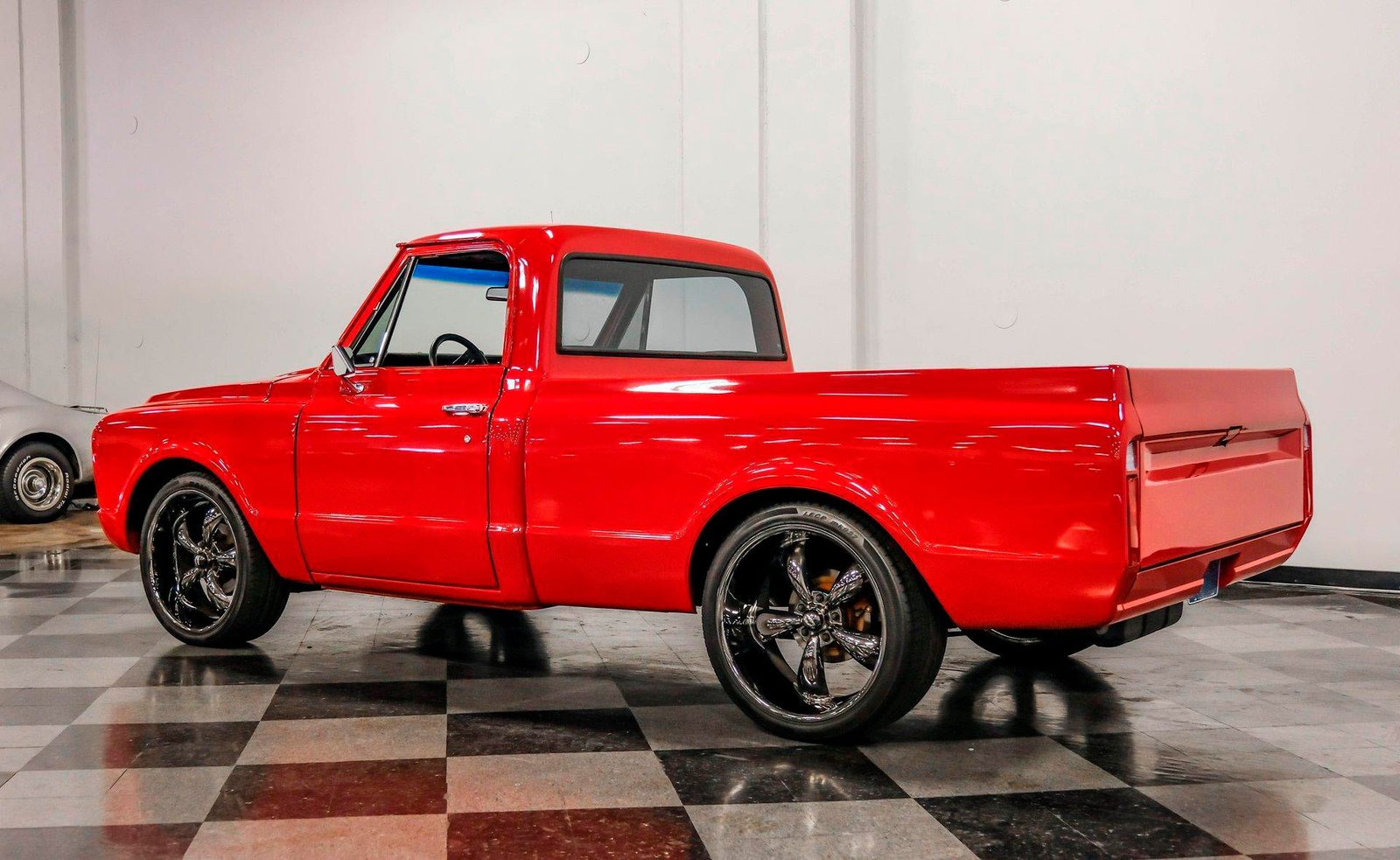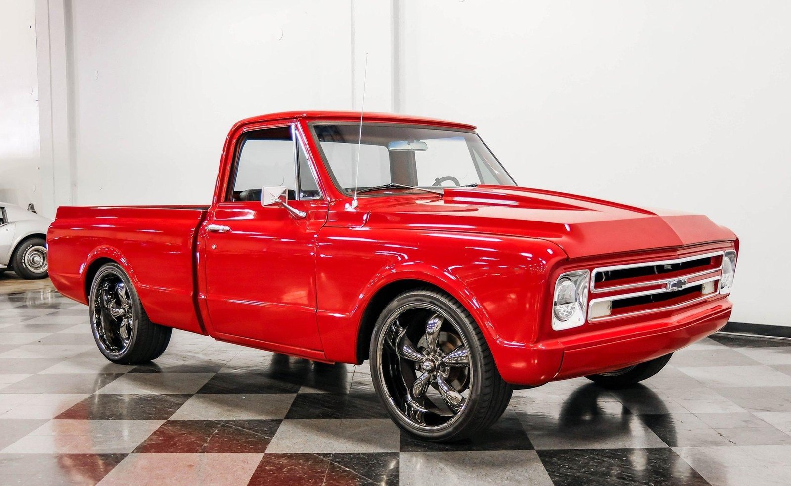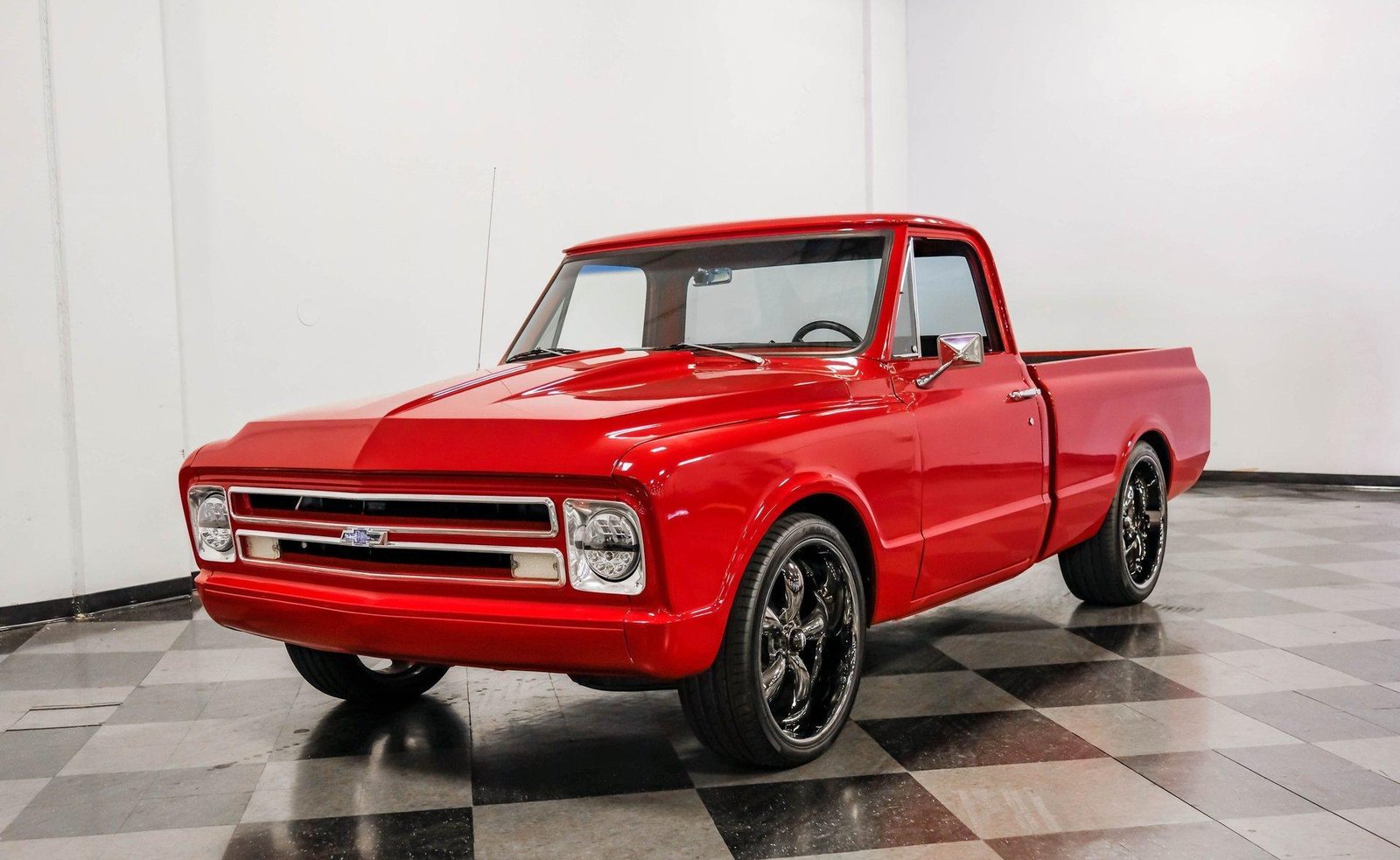 A sleek and lowered 1968 Chevrolet C10 Short Bed, finished in vibrant red with a cowl induction hood, Rhino-lined bed, and massive 22-inch Coys wheels — a modernized classic with serious street presence.