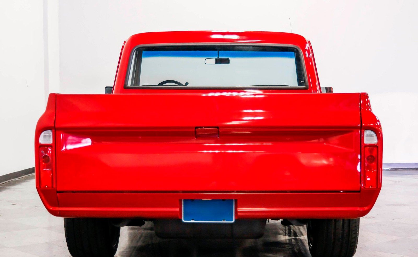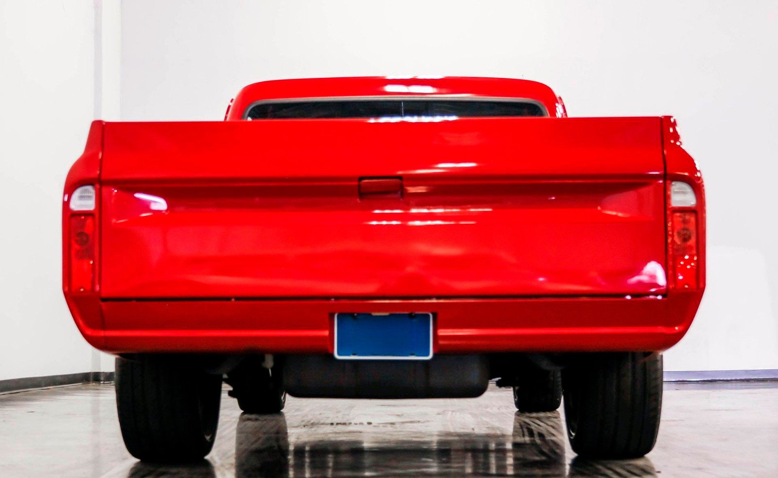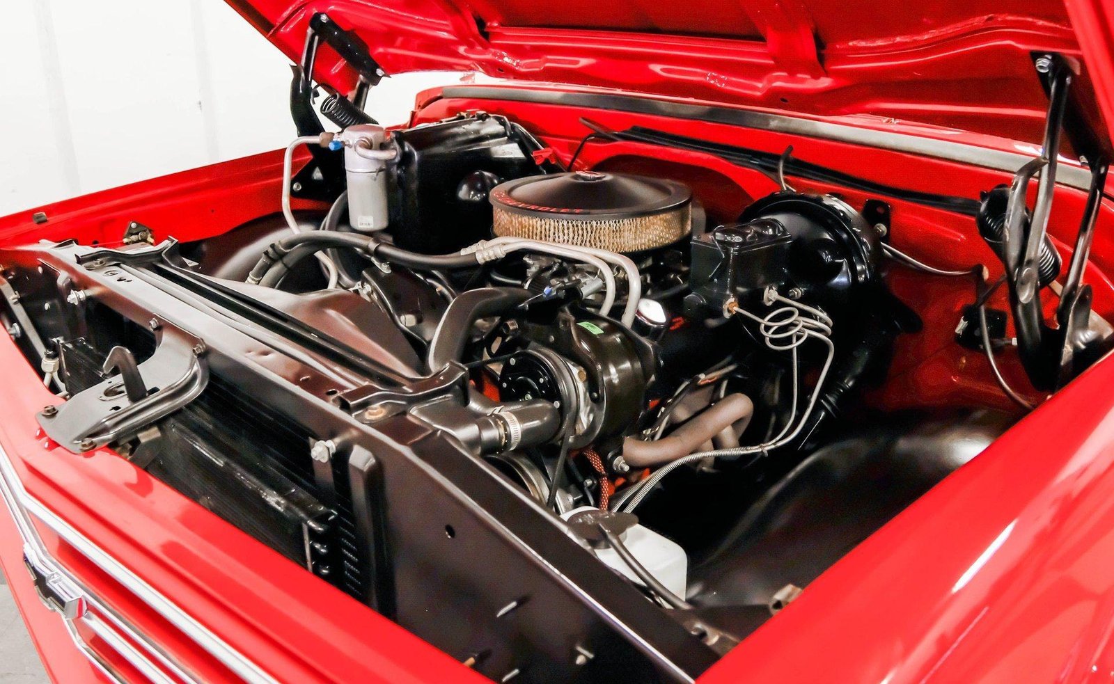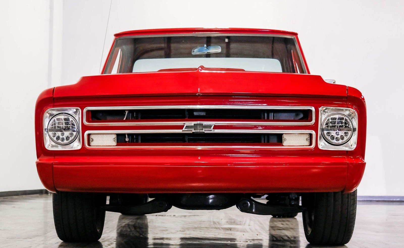 A sleek and lowered 1968 Chevrolet C10 Short Bed, finished in vibrant red with a cowl induction hood, Rhino-lined bed, and massive 22-inch Coys wheels — a modernized classic with serious street presence.