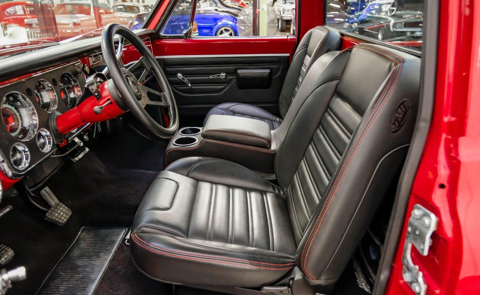 Exterior: Red paint with cowl hood, front and rear roll pans, tinted windows, custom headlights, Rhino-lined bed, and 22″ black chrome Coys Torque Thrust wheels with 265/35ZR22 front and 285/35ZR22 rear tires.