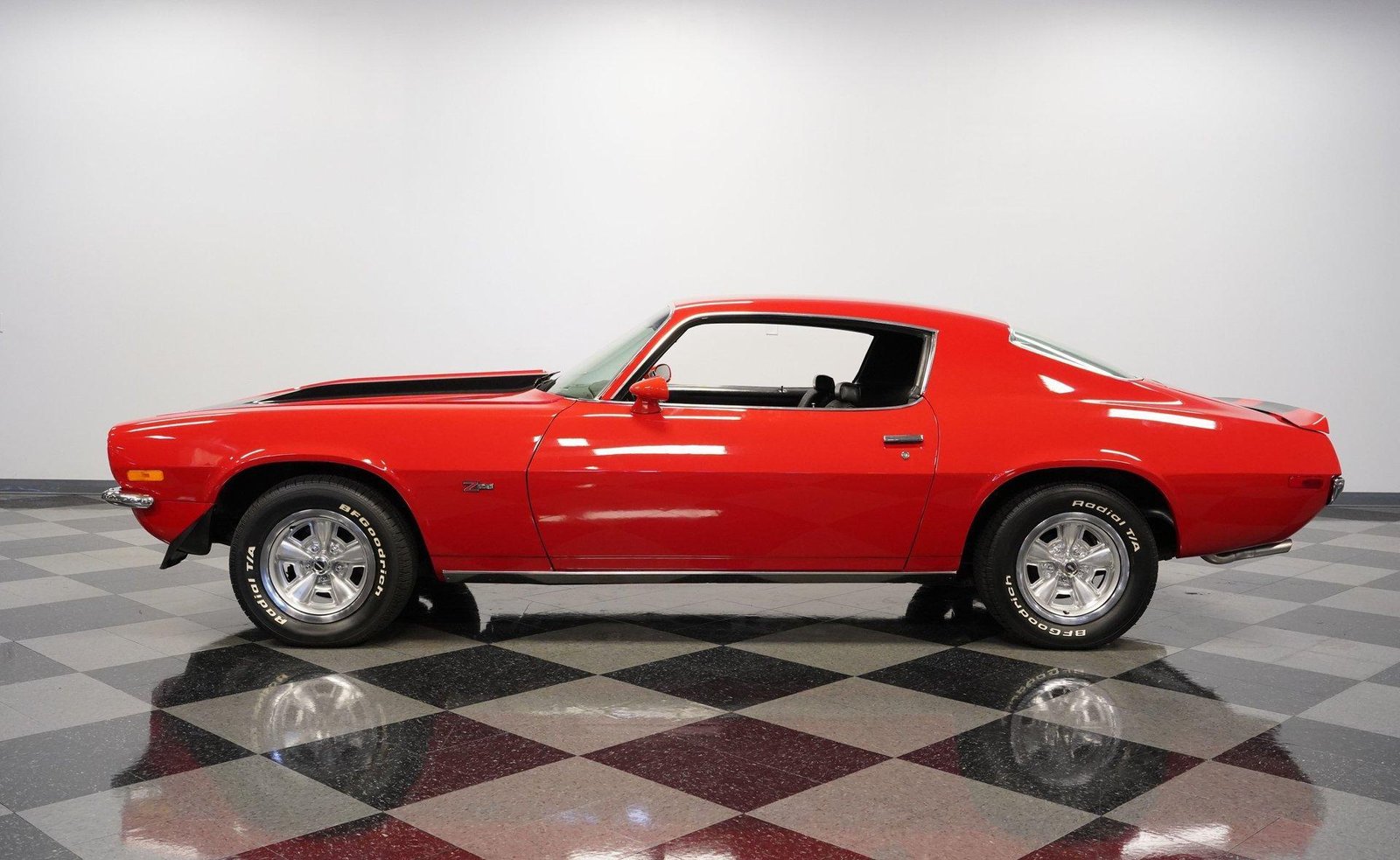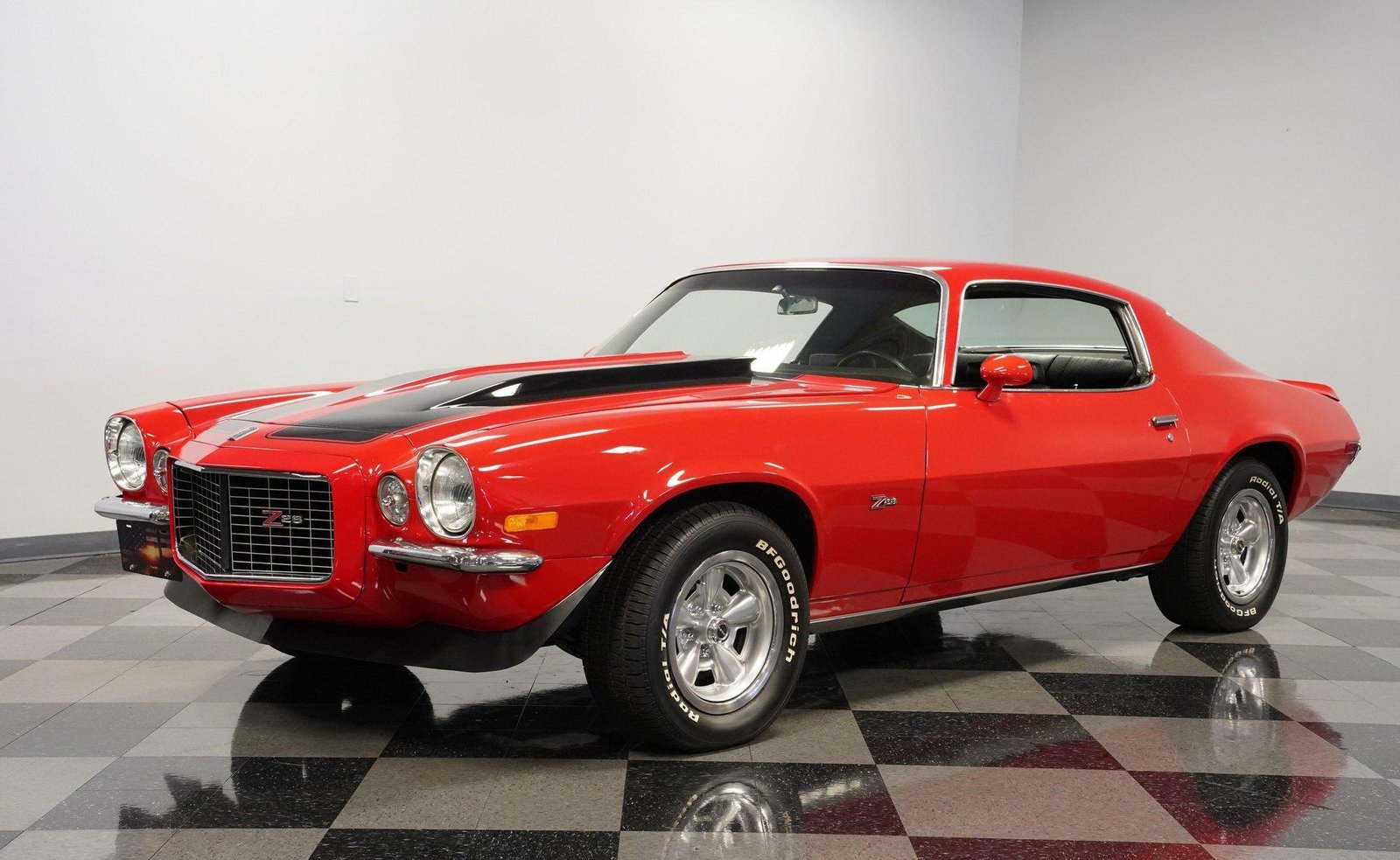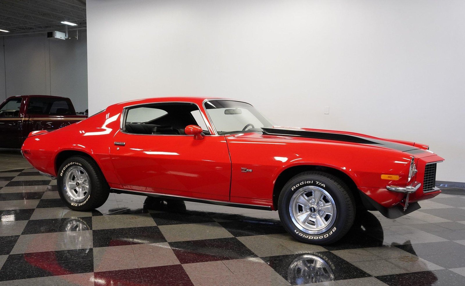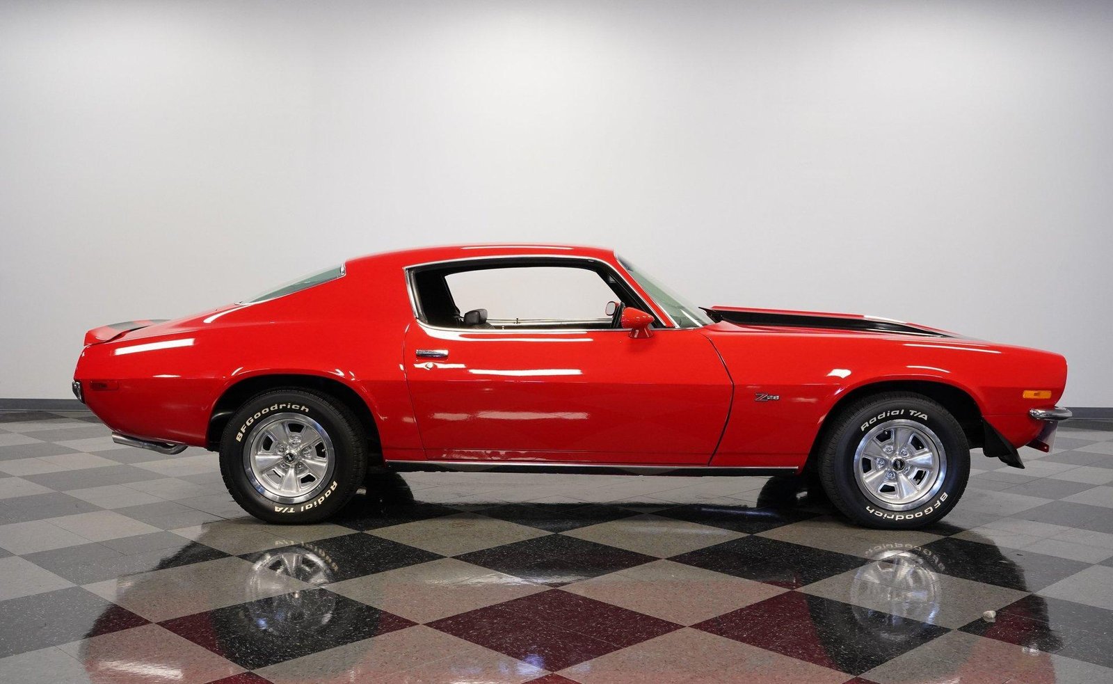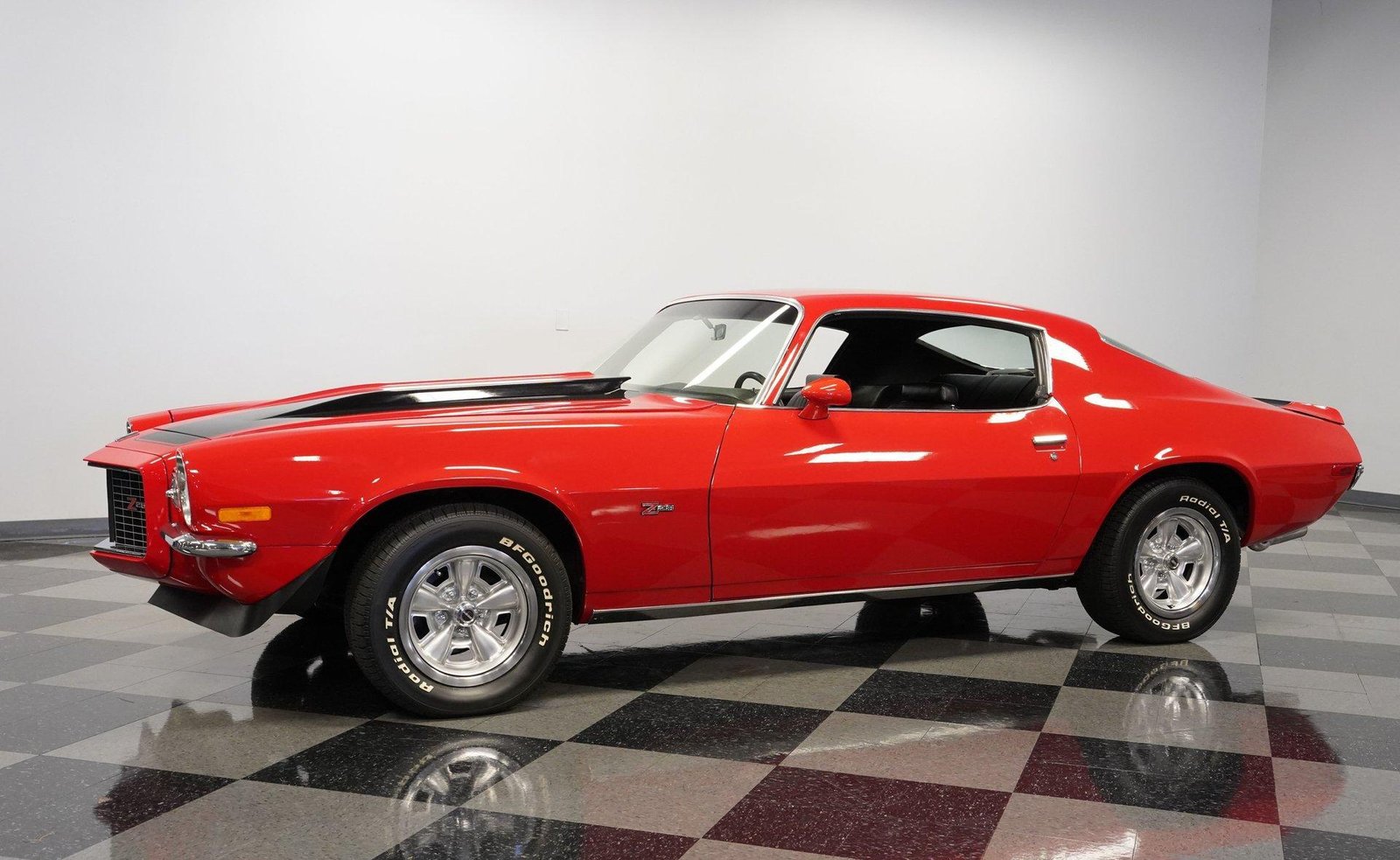Exterior: Red exterior with black stripes, cowl induction hood, front chin spoiler, chrome bumpers, 15″ Z28 wheels with beauty rings, and BFG Radial T/A 235/60R15 tires for the perfect period-correct stance.