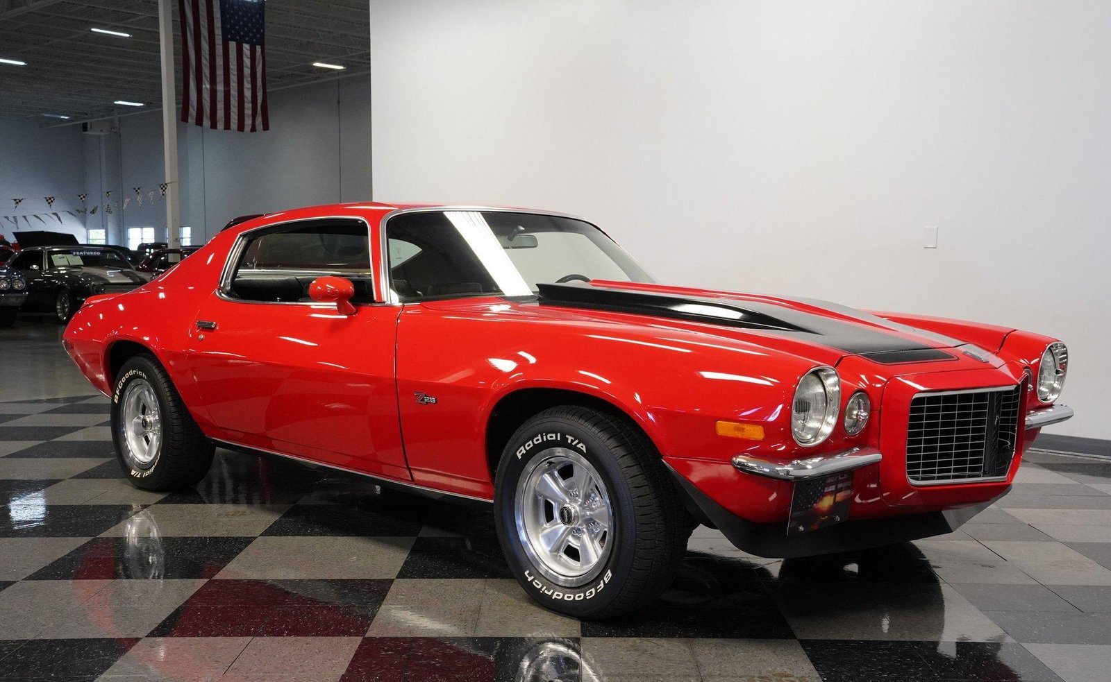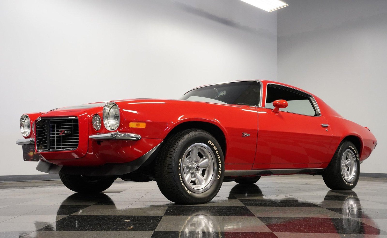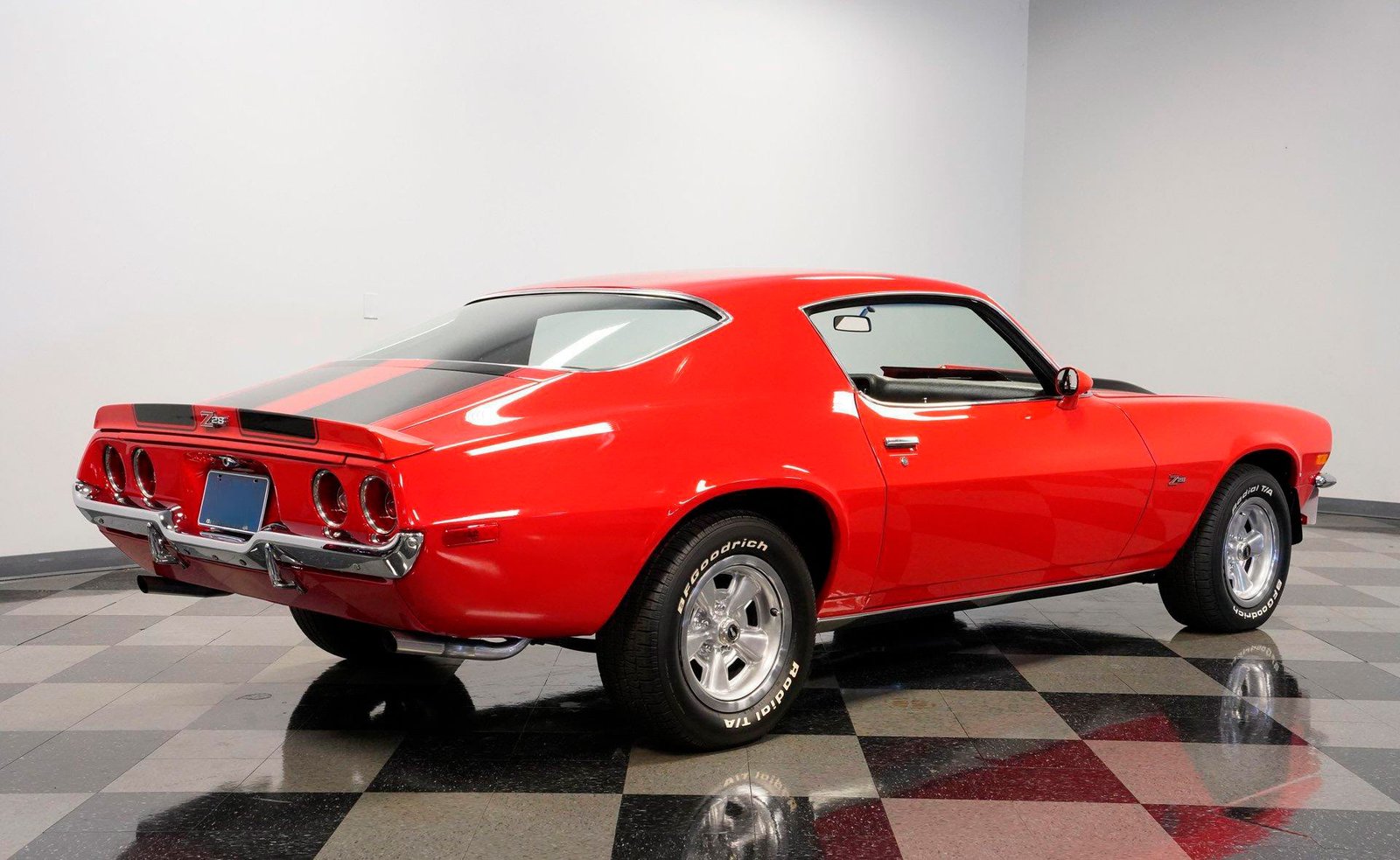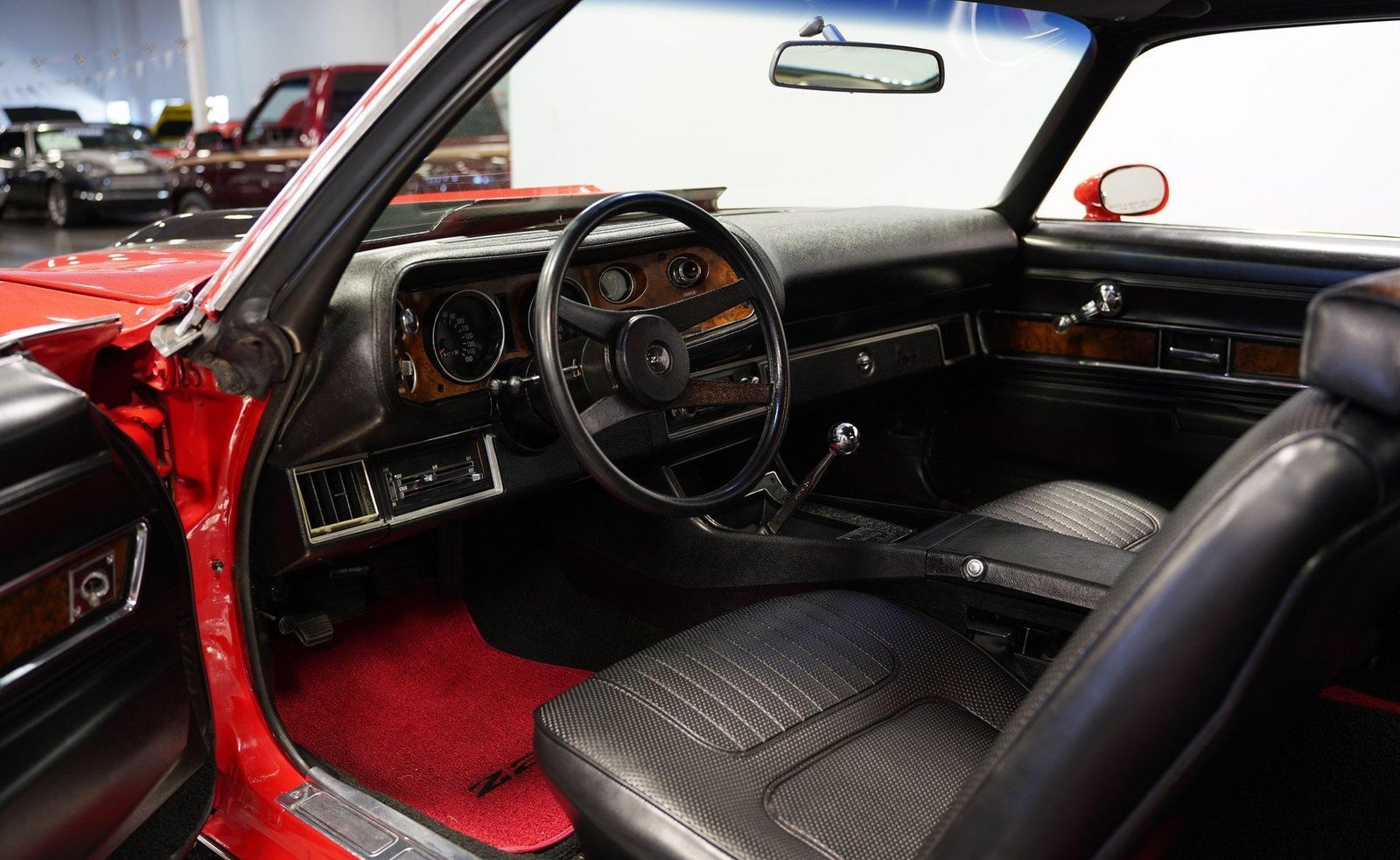 Exterior: Red exterior with black stripes, cowl induction hood, front chin spoiler, chrome bumpers, 15″ Z28 wheels with beauty rings, and BFG Radial T/A 235/60R15 tires for the perfect period-correct stance.