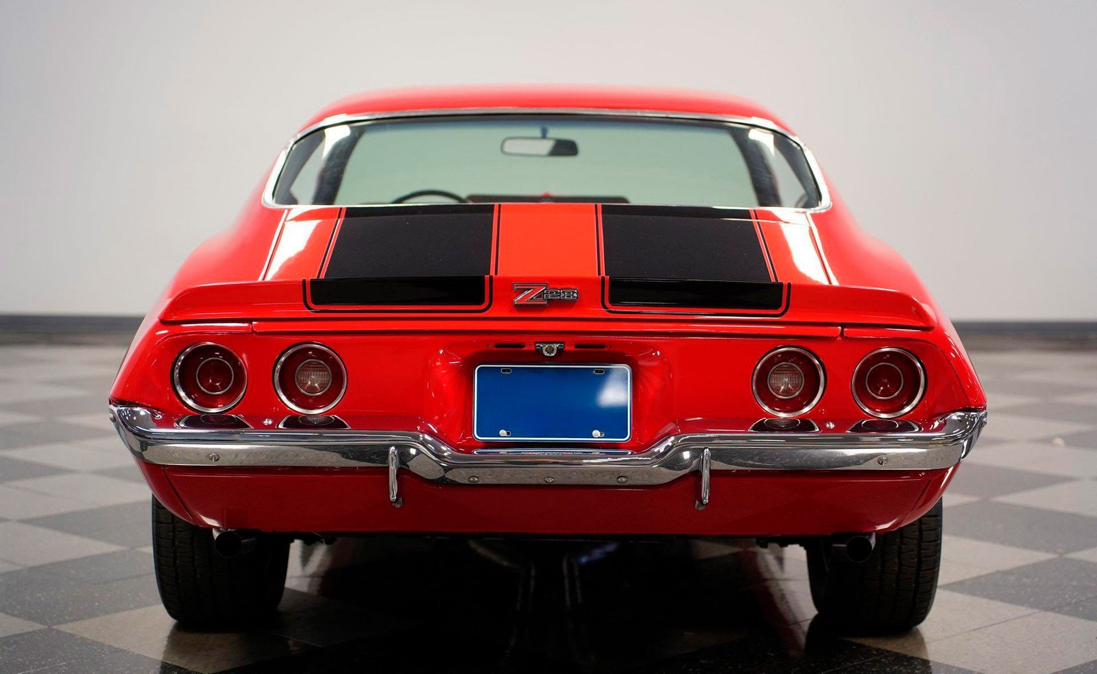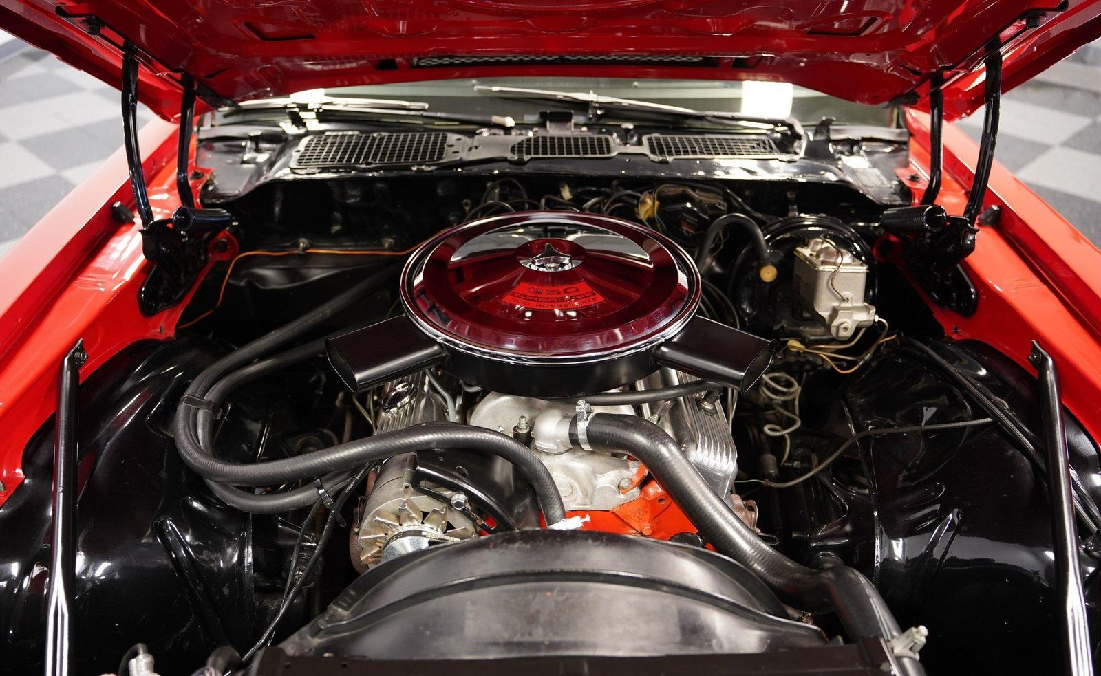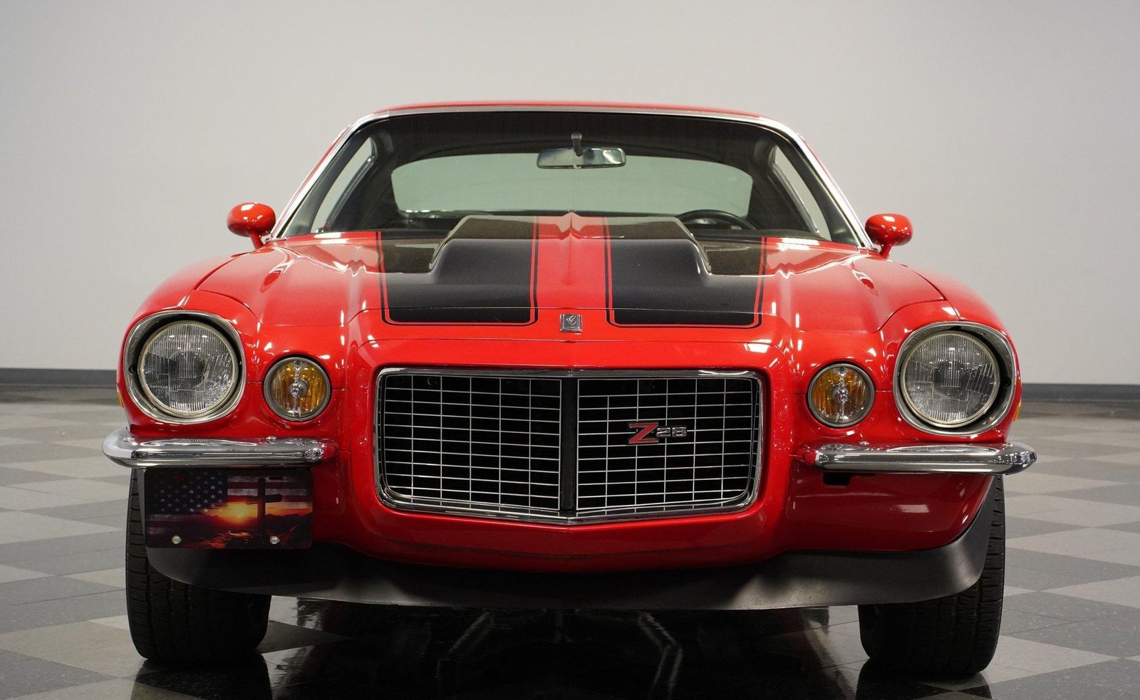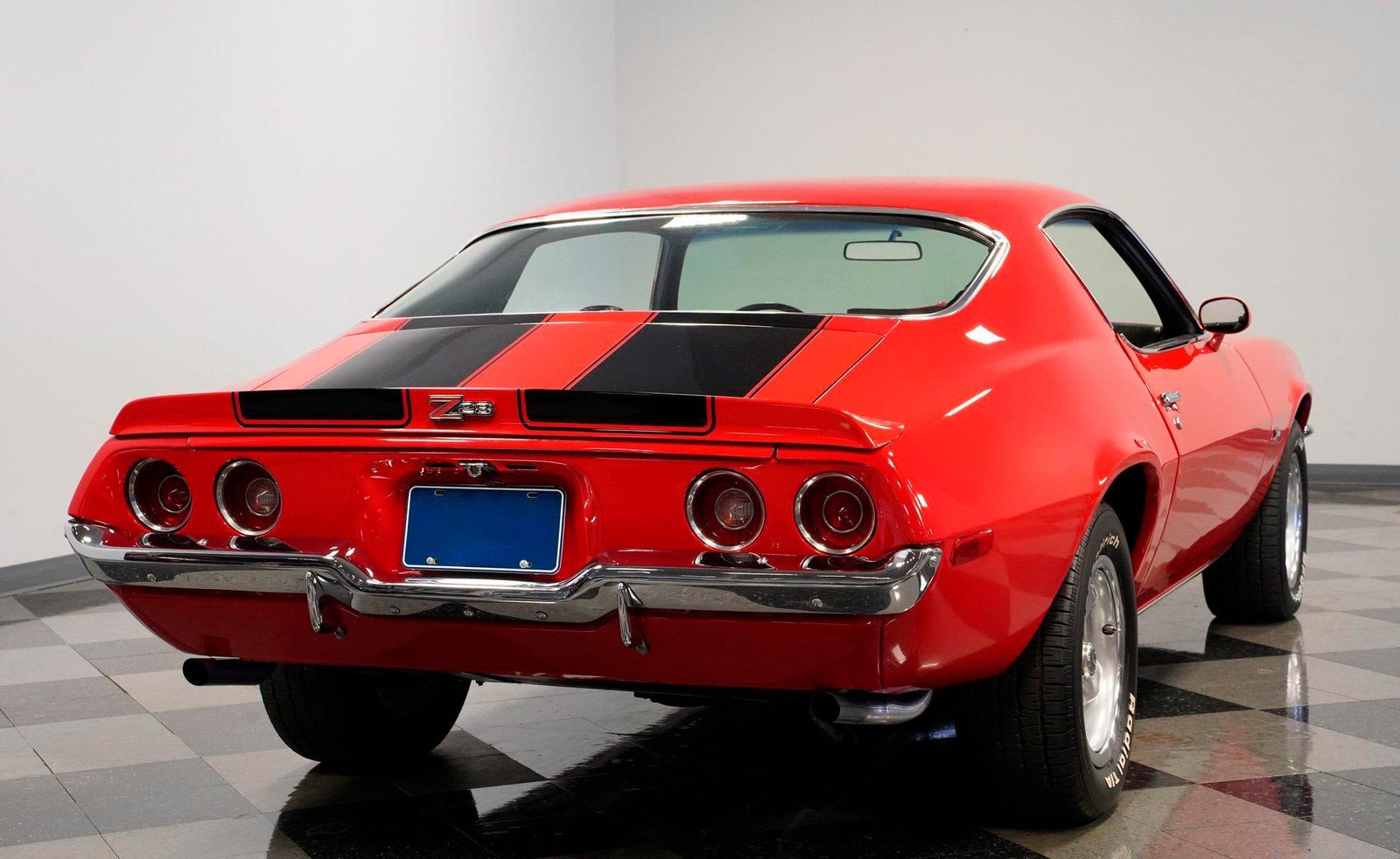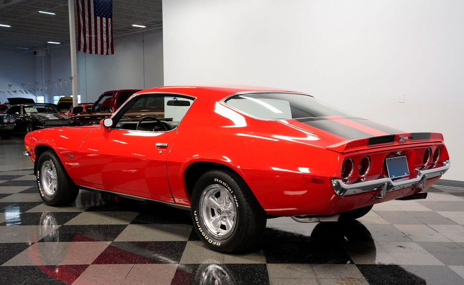 Exterior: Red exterior with black stripes, cowl induction hood, front chin spoiler, chrome bumpers, 15″ Z28 wheels with beauty rings, and BFG Radial T/A 235/60R15 tires for the perfect period-correct stance.