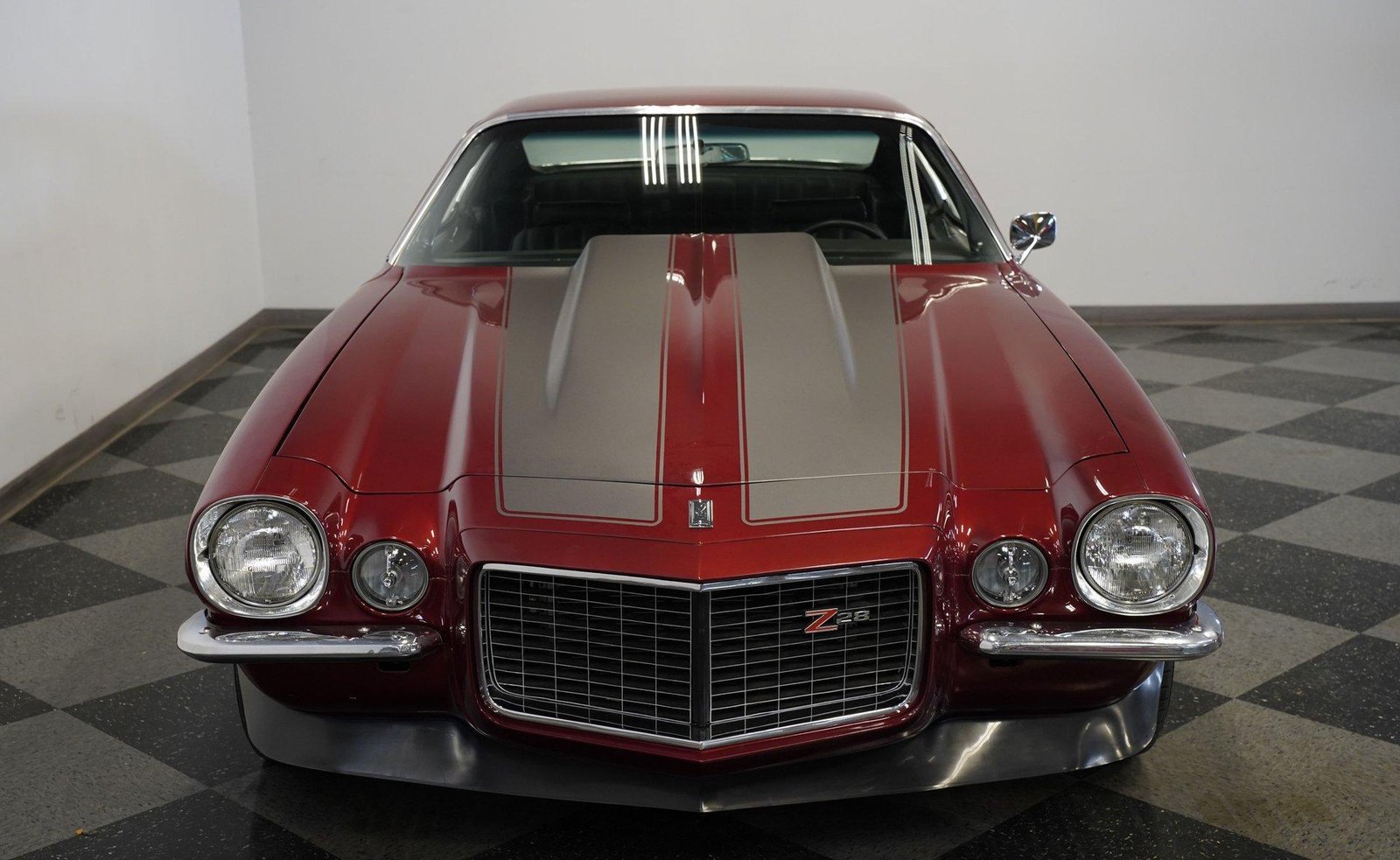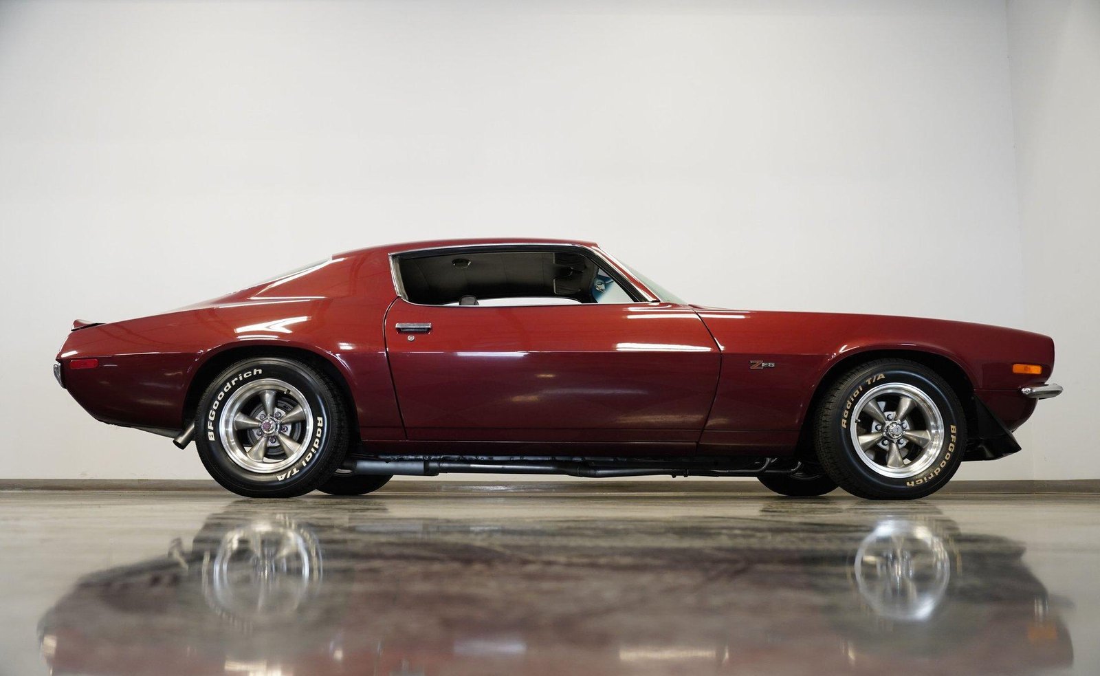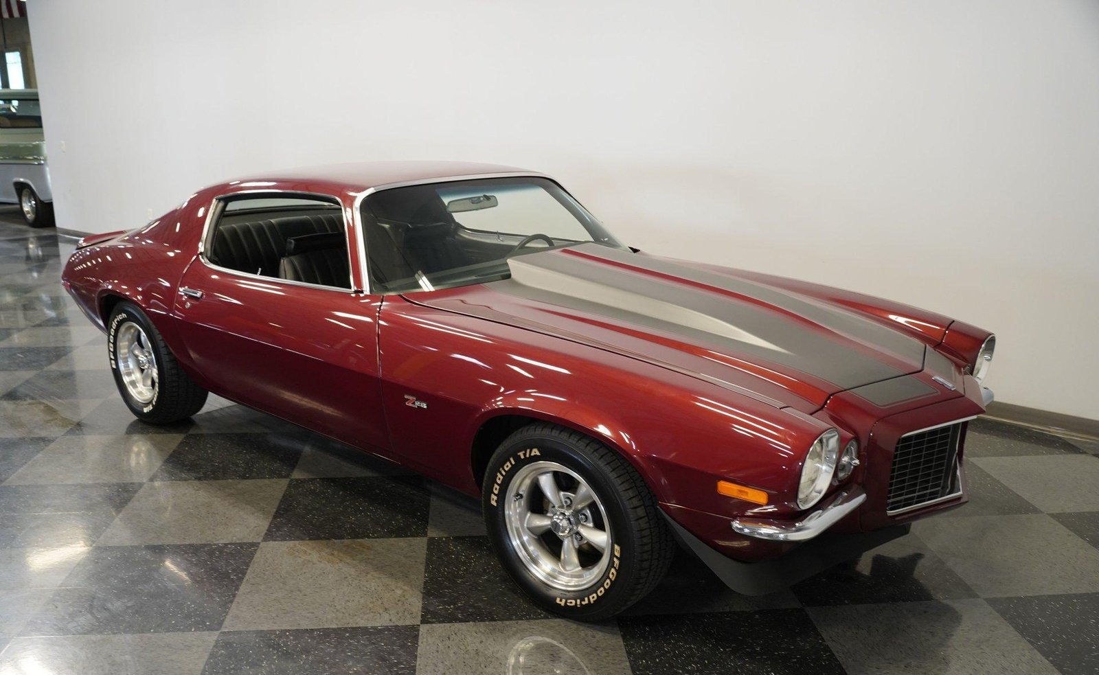 A beautifully restored 1970 Chevrolet Camaro RS Z28 Tribute, finished in deep maroon with a cowl induction hood and chin spoiler — blending authentic second-gen style with modern performance upgrades.