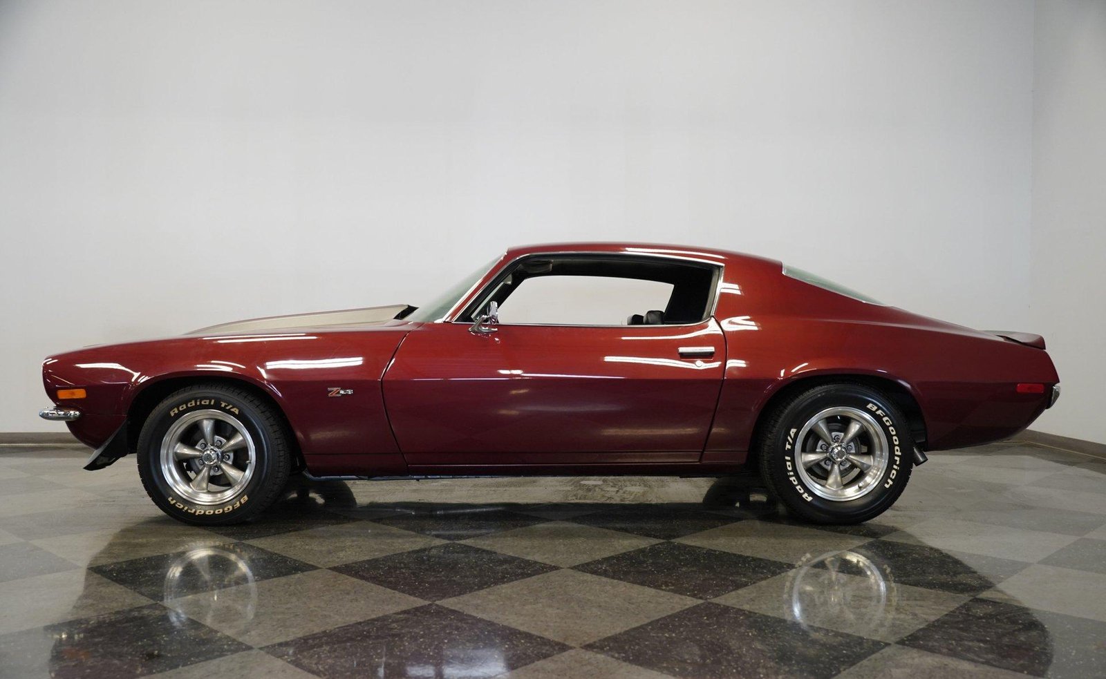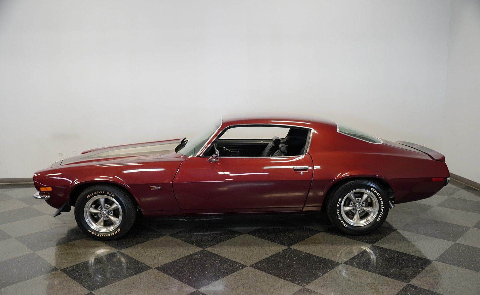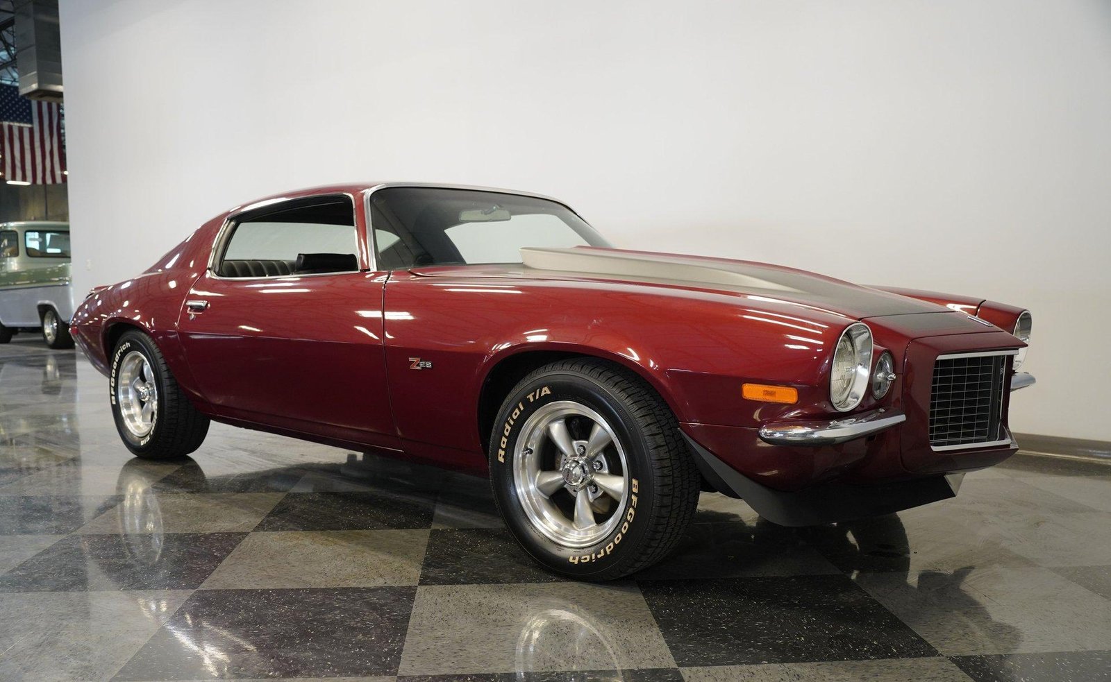A beautifully restored 1970 Chevrolet Camaro RS Z28 Tribute, finished in deep maroon with a cowl induction hood and chin spoiler — blending authentic second-gen style with modern performance upgrades.